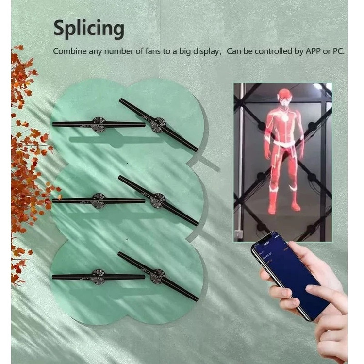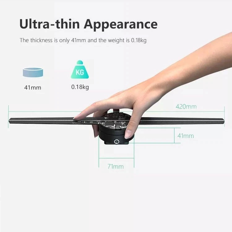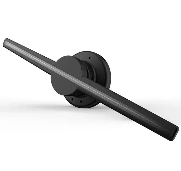فن هولوگرام سه بعدی (3D) یک نوع پروژکتور یا نمایشگر جدید است که می تواند تصاویر و ویدیوهای شما را از طریق اپلیکیشن یا مموری به صورت سه بعدی پخش کند. فن هولوگرام سه بعدی یک محصول منحصر به فرد است و کاربردهای بسیار گسترده ای از جمله برای تبلیغات، عرضه محصولات، تبلیغات فروشگاهی و مجازی، معرفی محصول و .... دارد. این نمایشگر از فناوری هولوگرافیک برای ارائه تصویر بهره می برد و با وزن و اندازه سبک و جمع و جوری که دارد می تواند به راحتی همه جا مورد استفاده قرار بگیرد. همچنین قابل نصب روی دیوار است و حتی میتواند با قرار گرفتن در کنار تعداد زیادی از فن های دیگر، تصویر سه بعدی واحدی را ارائه کند. نمایشگر سه بعدی فن هولوگرافی مدل HD-F42 جدیدترین و جذاب ترین نمایشگر تبلیغات هولوگرافیک سه بعدی معلق در هوا برای مرکز خرید،فروشگاههای لباس، رستوران، موزه، فروشگاه جواهرات و… میباشد.این دستگاه با استفاده از یک ماژول متحرک ال ای دی باعث ایجاد تصاویر سه بعدی میشود.تصاویر هولوگرافیک که به وسیله چرخش ایجاد میشود باعث جلب توجه افراد میشود.هولوگرام فن می تواند تصاویر رنگی و متحرک را به صورت سه بعدی معلق در هوا در اندازه 42 سانتی متر نمایش دهد. سیستم هولوگرافیک پروجکشن (Holographic Projection) تصویری تمام رنگی با رزولوشن بالا و بدون محدویت مکانی به صورت سه بعدی ارائه می دهد. بینندگان می توانند یک شئ و یا شخص واقعی را روی صحنه ببینند در حالی که با تصویر شئ و شخص مجازی در تعامل هستند. این تصاویر در چشم انسان در فضا با عمق و پرسپکتیو و به صورت معلق دیده می شوند و تجربه ای به شدت نزدیک به واقعیت را در ذهن مخاطب ایجاد می کند. یکی از نکات مهم هولوگرافیک پروجکشن عدم نیاز به استفاده از عینک های مخصوص است و بیننده می تواند به طور مستقیم و بدون واسطه با تصویر مورد نظر ارتباط برقرار کند.پخش تصاویر هولوگرافیک می تواند روی یک صحنه (با تجهیزات خاص) و یا توسط یک پروجکتور روی یک صفحه شفاف و نامرئی ارائه شوند. در این پروژکتور از چراغ های LED استفاده شده و بسته به تعداد LED، سرعت چرخش و وات دستگاه، کیفیت تصویر نیز تغییر می کند. این دستگاه از فرمت های تصویری MP4، AVI، RMVB و JPG پشتیبانی می کند. دستگاه دارای ریموت است و به راحتی می توانید آن را کنترل کنید.