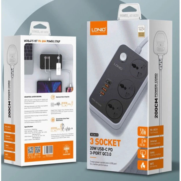 سه راهی برق الدینیو SC-3412اولین سه برق 20وات جهان میباشد. با توجه به گسترش کاربرد وسایل الکترونیکی در کارهای روزمره، بشر به پریزهای برق بیشتری نیاز پیدا کردکه این مشکل را چندراهیهای برق حل کردند. در اولین قدم برای بررسی چندراهی باکیفیت الدینیو مدل LDNIO SC3412 به سراغ وضعیت ظاهری و فیزیکی آن میرویم،همانطور که از کیفیت ساخت و سابقه درخشان این برند انتظار میرود، بدنه بیرونی این وسیله از جنس پلاستیک مقاوم و باکیفیت است.این سه راهی ضد آتش سوزی طراحی شده و توانایی تحمل 850 درجه را داراست. یکی دیگر از خصوصیات ظاهری این وسیله دکمه پاور است که روی بدنه قرار دارد و شما با آن میتوانید در مواقع لزوم چندراهی را خاموش و روشن کنید طول کابل نیز عامل دیگری است که دامنه استفاده شما را بهبود میبخشد.طول کابل LDNIO SC3412 حدوداً 2 متر است و برای استفاده روزانه مناسب است. ابعاد دستگاه 138x 90x 43 میلیمتر است که برای قرار گرفتن روی میز و هرجایی که با کمبود فضا روبهرو هستید مناسب است.این وسیله وزن قابل قبولی نیز دارد شرکت الدینیو این چند راهی را با وزن 390 گرم به بازار عرضه کرده است این دستگاه نشانگر LED نیز دارد. چندراهی برق الدینیو یک وسیله بسیار کاربردیدر این چندراهی سه پریز برق تعبیه شده که در ادامه به بررسی آنها میپردازیم در کنار پریزهای برق ورودیهای USB نیز در روی بدنه تعبیه شده که به کارایی این چندراهی میافزاید.به این صورت با سه پریز برق و4 ورودی USB (با پشتیبانی از فناوری های PDوQC3.0) شما یک وسیله چندکاره خواهید داشت. تعداد پریزهای برق چند راهی تا حد معمول آن بسیار پرکاربرد است و اگر از تعدادی بیشتر شود ایمنی دستگاه کم میشوداین چندراهی سه پریز برق کاملاً ایمن دارد. هر سه این پریزها به پایههای ارت مجهز هستند. پوشش محافظ کودک امتیاز دیگری است که چندراهی LDNIO SC3412 Power Strip را از سایر چندراهیها متفاوت میکند
