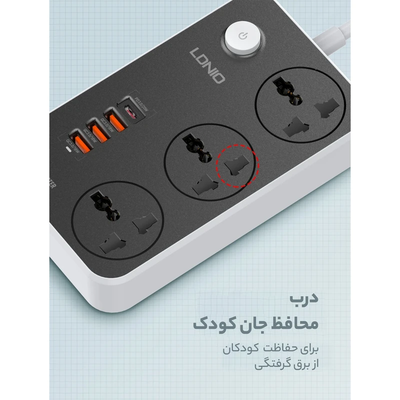 سه راهی برق الدینیو SC-3412اولین سه برق 20وات جهان میباشد. با توجه به گسترش کاربرد وسایل الکترونیکی در کارهای روزمره، بشر به پریزهای برق بیشتری نیاز پیدا کردکه این مشکل را چندراهیهای برق حل کردند. در اولین قدم برای بررسی چندراهی باکیفیت الدینیو مدل LDNIO SC3412 به سراغ وضعیت ظاهری و فیزیکی آن میرویم،همانطور که از کیفیت ساخت و سابقه درخشان این برند انتظار میرود، بدنه بیرونی این وسیله از جنس پلاستیک مقاوم و باکیفیت است.این سه راهی ضد آتش سوزی طراحی شده و توانایی تحمل 850 درجه را داراست. یکی دیگر از خصوصیات ظاهری این وسیله دکمه پاور است که روی بدنه قرار دارد و شما با آن میتوانید در مواقع لزوم چندراهی را خاموش و روشن کنید طول کابل نیز عامل دیگری است که دامنه استفاده شما را بهبود میبخشد.طول کابل LDNIO SC3412 حدوداً 2 متر است و برای استفاده روزانه مناسب است. ابعاد دستگاه 138x 90x 43 میلیمتر است که برای قرار گرفتن روی میز و هرجایی که با کمبود فضا روبهرو هستید مناسب است.این وسیله وزن قابل قبولی نیز دارد شرکت الدینیو این چند راهی را با وزن 390 گرم به بازار عرضه کرده است این دستگاه نشانگر LED نیز دارد. چندراهی برق الدینیو یک وسیله بسیار کاربردیدر این چندراهی سه پریز برق تعبیه شده که در ادامه به بررسی آنها میپردازیم در کنار پریزهای برق ورودیهای USB نیز در روی بدنه تعبیه شده که به کارایی این چندراهی میافزاید.به این صورت با سه پریز برق و4 ورودی USB (با پشتیبانی از فناوری های PDوQC3.0) شما یک وسیله چندکاره خواهید داشت. تعداد پریزهای برق چند راهی تا حد معمول آن بسیار پرکاربرد است و اگر از تعدادی بیشتر شود ایمنی دستگاه کم میشوداین چندراهی سه پریز برق کاملاً ایمن دارد. هر سه این پریزها به پایههای ارت مجهز هستند. پوشش محافظ کودک امتیاز دیگری است که چندراهی LDNIO SC3412 Power Strip را از سایر چندراهیها متفاوت میکند