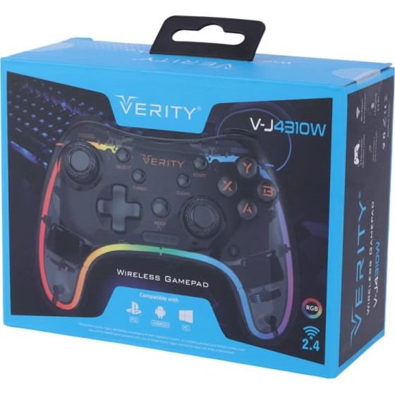 دسته بازی بی سیم وریتی مدل VERITY V-J4310W از جنس پلاستیک باکیفیت و مقاوم در برابر آسیب های احتمالی همچون ضربه و فشار ساخته شده است. این دسته بازی مجهز به نورپردازی RGB جهت ایجاد جلوه بصری زیبا در محیط کم نور بوده و عمر تقریبی آن 500,000 ساعت می باشد. اتصال این گیم پد به صورت بی سیم بوده و از طریق دانگل USB با فرکانس 2.4 گیگاهرتز به کامپیوتر متصل می شود. این دسته بازی با انواع کنسول PS3، کامپیوتر و اندروید سازگار است. انرژی این محصول از طریق باتری داخلی با ظرفیت 800 میلی آمپر ساعت تامین می شود و زمان شارژ شدن در حدود 2 الی 2.5 ساعت می باشد. بوسیله درگاه Type-C و کابل همراه می توانید مجددا شارژ نمایید. میزان شارژدهی آن به طور تقریبی برابر با 4 الی 12 ساعت است. مجهز به 2 جوی استیک روان و موتور لرزاننده و طراحی شده به صورت ارگونومیک جهت جلوگیری از خستگی دست از دیگر ویژگی های این محصول به شمار می آید